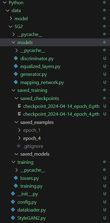 This will allows us to adjust each individual component as we need to, or add any relevant component into our project without too much delay in implementing it into the flow. Once I got the StyleGAN2 network running without flags, I had it do some test training just to make sure that each component that I implemented was working correctly. It was able to find the images, start training off the 1000 sample images I provided it and generate a blob.